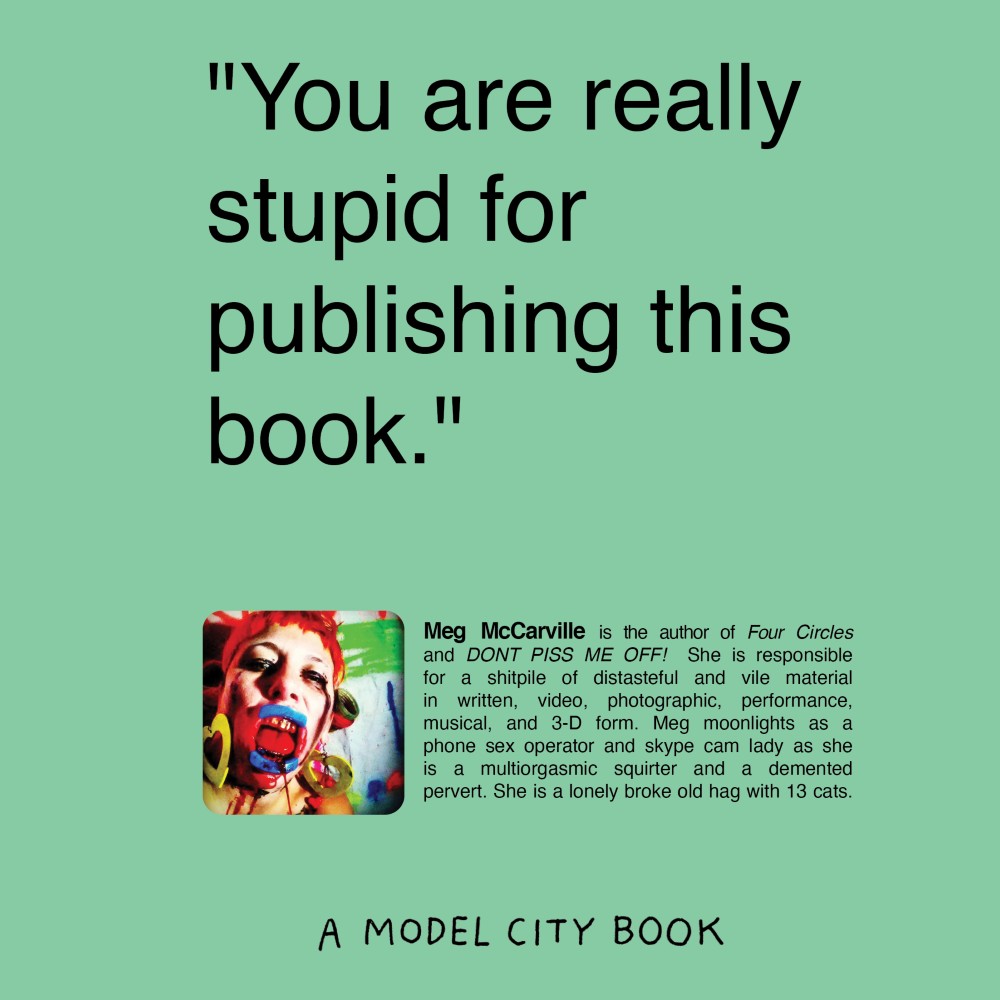 Meg McCarville is the author of Four Circles and DONT PISS ME OFF! She is responsible for a shitpile of distasteful and vile material in written, video, photographic, performance, musical, and 3-D form. Meg moonlights as a phone sex operator and skype cam lady as she is a multiorgasmic squirter and a demented pervert. She is a lonely broke old hag with 13 cats.